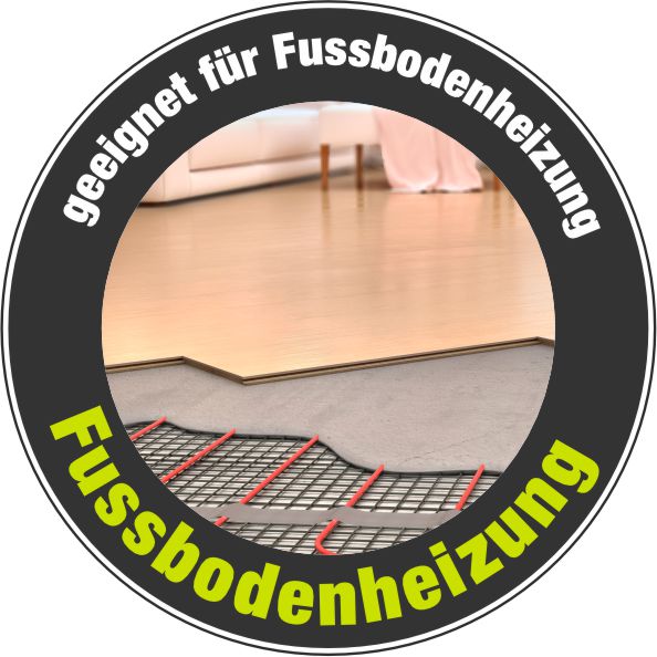 Unser Laminatboden ist dank seiner hohen Materialdichte problemlos auf Fußbodenheizung - egal ob Elektro- oder Warmwasserheizung bis 27°C - zu verlegen.